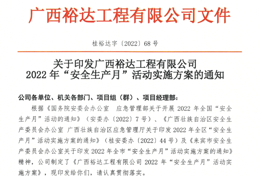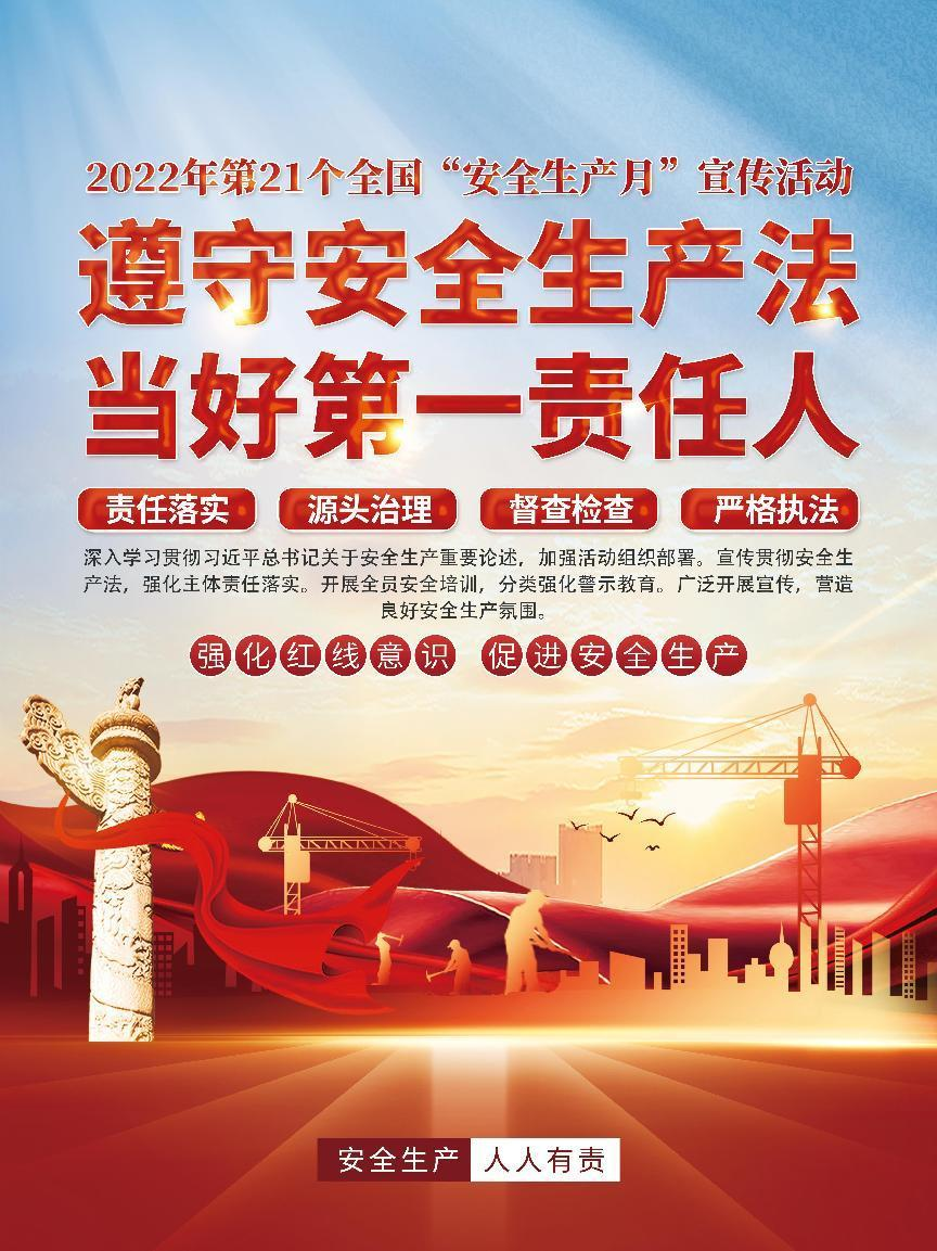 收到通知后公司积极响应贯彻落实并发布了《关于印发九游·体育(jiuyou.com)官方网站2022年“安全生产月”活动实施方案的通知》要求公司全体人员认真深入学习贯彻习近平总书记关于安全生产重要论述,加强活动组织部署。宣传贯彻安全生产法,强化主体责任落实。开展全员安全培训,分类强化警示教育。广泛开展宣传,营造良好安全生产氛围,以优异成绩迎接党的二十大顺利召开。