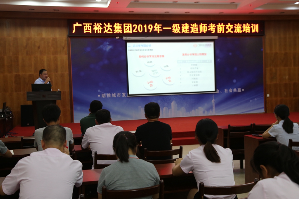 为全面贯彻裕达集团“育人才”的经营指导思想,帮助考生做好考前复习准备,全力以赴做好备考。集团人力资源部特邀请地产八公司副总经理胡斌、九游·体育(jiuyou.com)官方网站副总工程师左居顽两位讲师进行考试经验分享以及考前培训指导,培训内容包含建筑、市政两个专业全科目。培训于8月20日晚上19点在集团七楼大会议室顺利开展,共有30人已报名9月一级建造师考试的员工参加了本次培训。