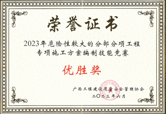 6月29日,工程公司在南宁参加由广西工程建设质量安全管理协会主办的2023年全区建设工程危大工程专项施工方案编制技能晋级决赛,喜获优胜奖。