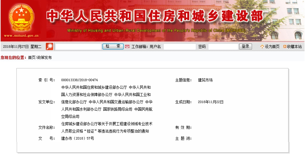 为遏制工程建设领域专业技术人员职业资格“挂证”现象,维护建筑市场秩序,促进建筑业持续健康发展,住房城乡建设部、人力资源社会保障部、工业和信息化部、交通运输部、水利部、铁路局、民航局决定开展工程建设领域专业技术人员职业资格“挂证”等违法违规行为专项整治(以下简称专项整治)。现将有关事项通知如下: